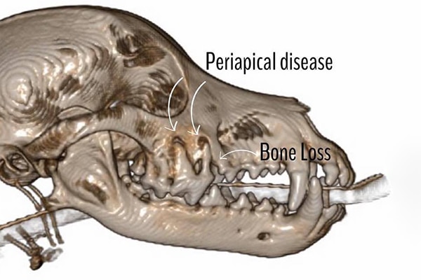 Nearly 75% of all pets over the age of three suffer silently with periodontal disease. Periodontal disease starts as bacteria mixed with food particles and saliva creating plaque on the tooth surface and along the gumline. The earliest sign of periodontal disease is gingivitis or red and swollen gums. If untreated, the plaque can then mineralize into more visible tarter and calculus. Not only does this lead to bad breath and discolored teeth, but the infection also begins to affect the tooth’s’ supporting structures and even the bone of the jaw around the tooth.