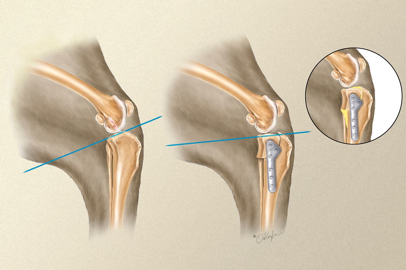 Rather than replacing the torn ligament, TPLO works by altering the angle of the tibial plateau. This neutralizes abnormal forward motion of the tibia (tibial thrust) during weight-bearing, allowing the knee to function without depending on the damaged ligament. Each patient is individually evaluated to determine whether TPLO is the most appropriate treatment option.